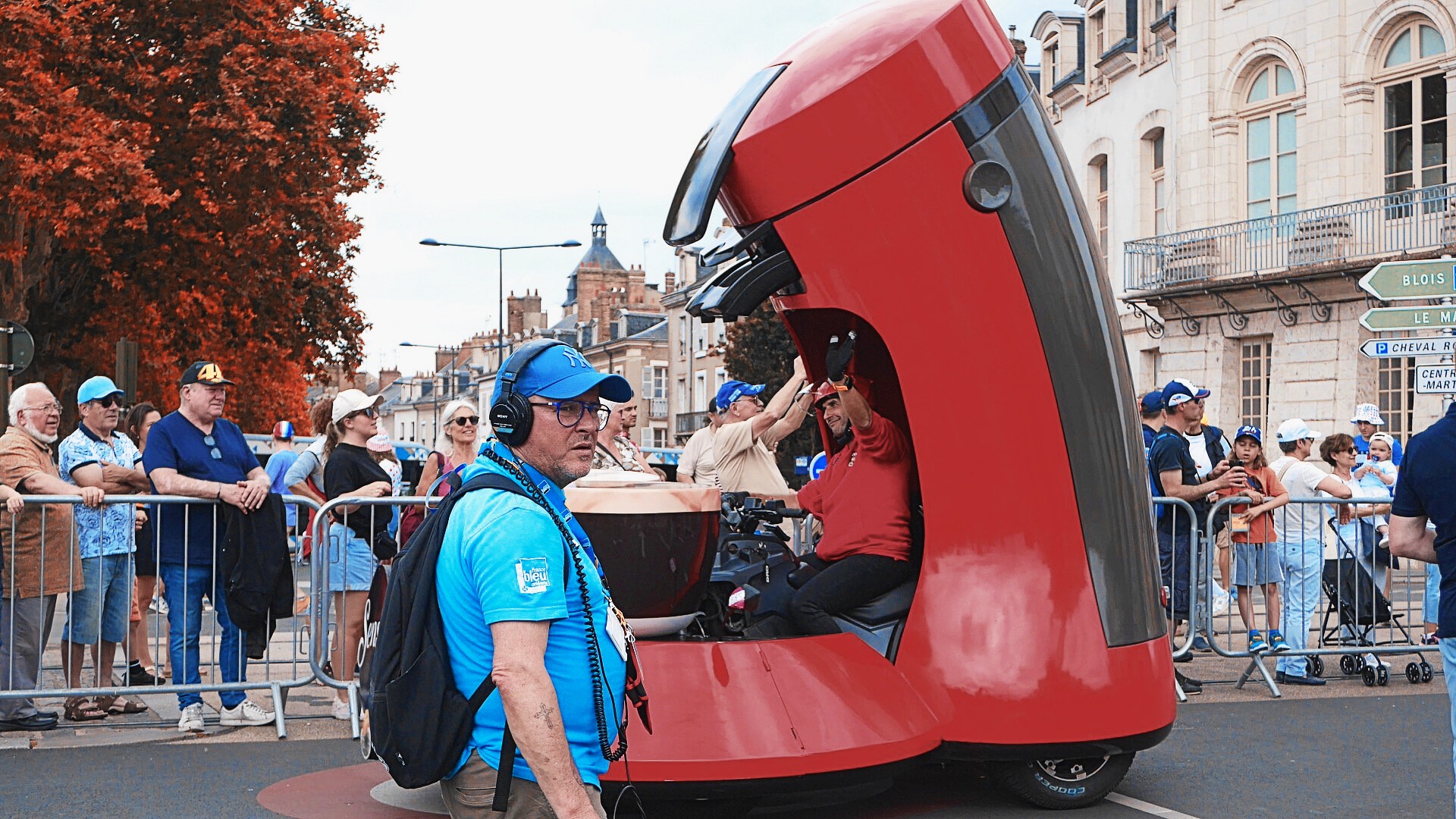 Les coureurs du Tour de France sont passés à toute vitesse devant l’objectif de mon appareil photo et bien entendu je me suis trompé dans les réglages (priorité à la vitesse mal gérée). Bilan j’ai loupé toutes les photos des coureurs ! Je sauve tout de même un peu la mise avec une chouette photo de Christian Prudhomme, le directeur de la Grande Boucle (en compagnie de votre serviteur) et ces photos de la caravane publicitaire que je partage ici avec vous. Sorry !